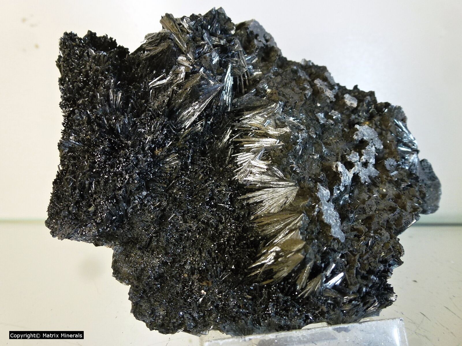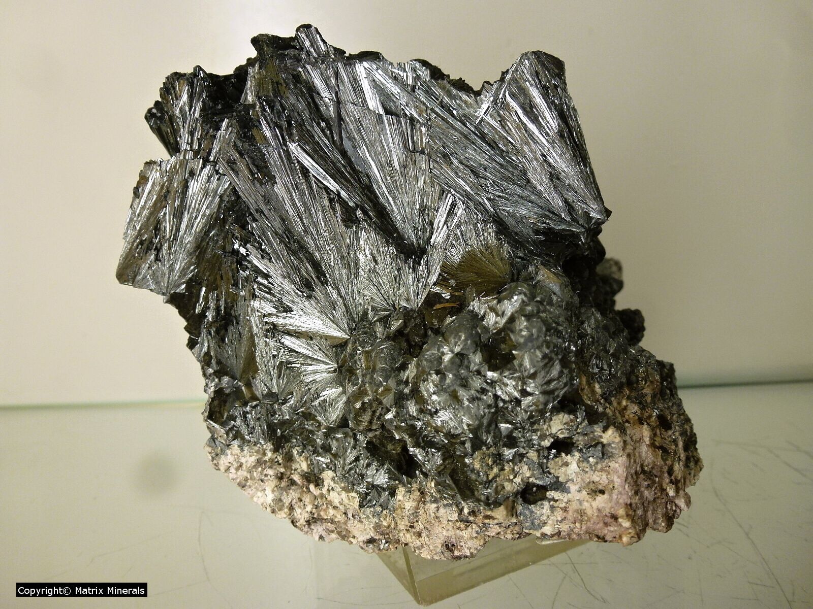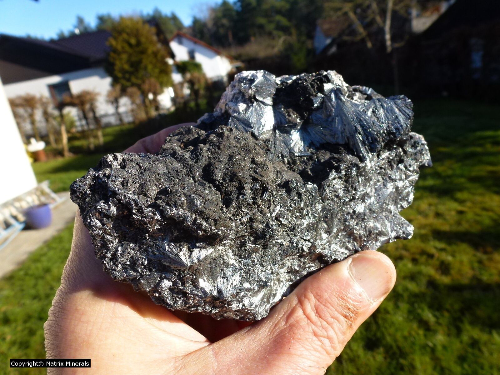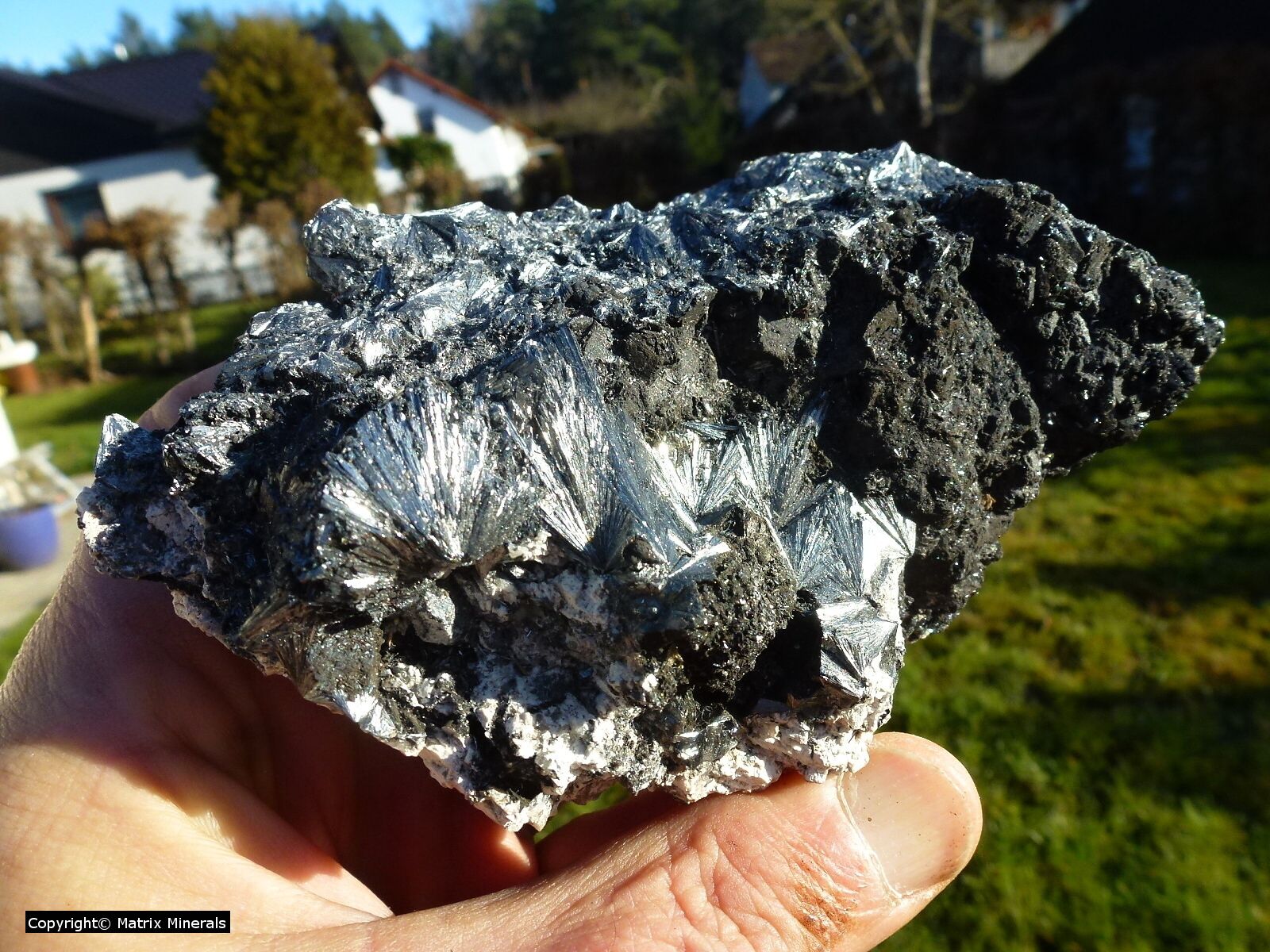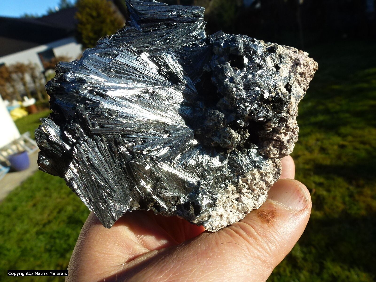 | Fundort:Grube Gremmelsbach Triberg Schwarzwald | Das Mineral Pyrolusit ist ein Manganerz Chem. ( Mno2 ) welches sich hier als nadelige bis radialstrahlige langprismatische Kristalle gebildet haben. Teilweise eingewachsen oder auch freistehende Kristalle je nach Stufe. Sehr intensiver silbriger Glanz. Tolle Sammlerstufen ! In diesem Fall mit eher seltenen freistehenden Kristallen ! |