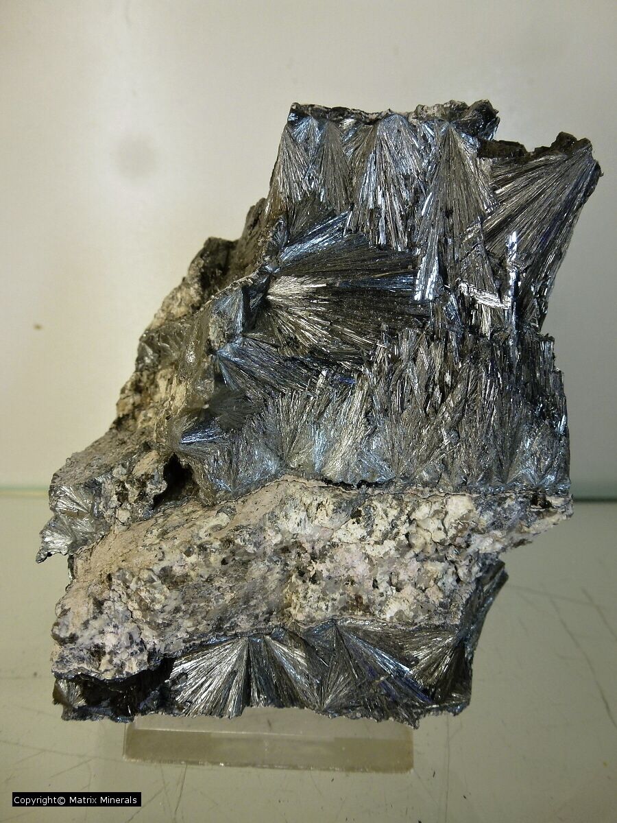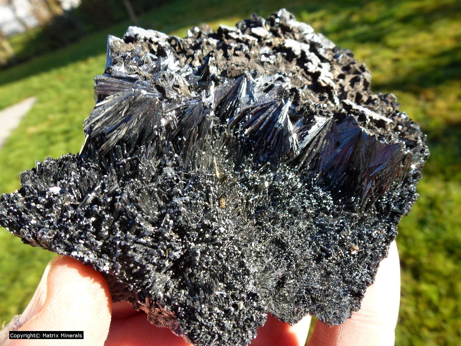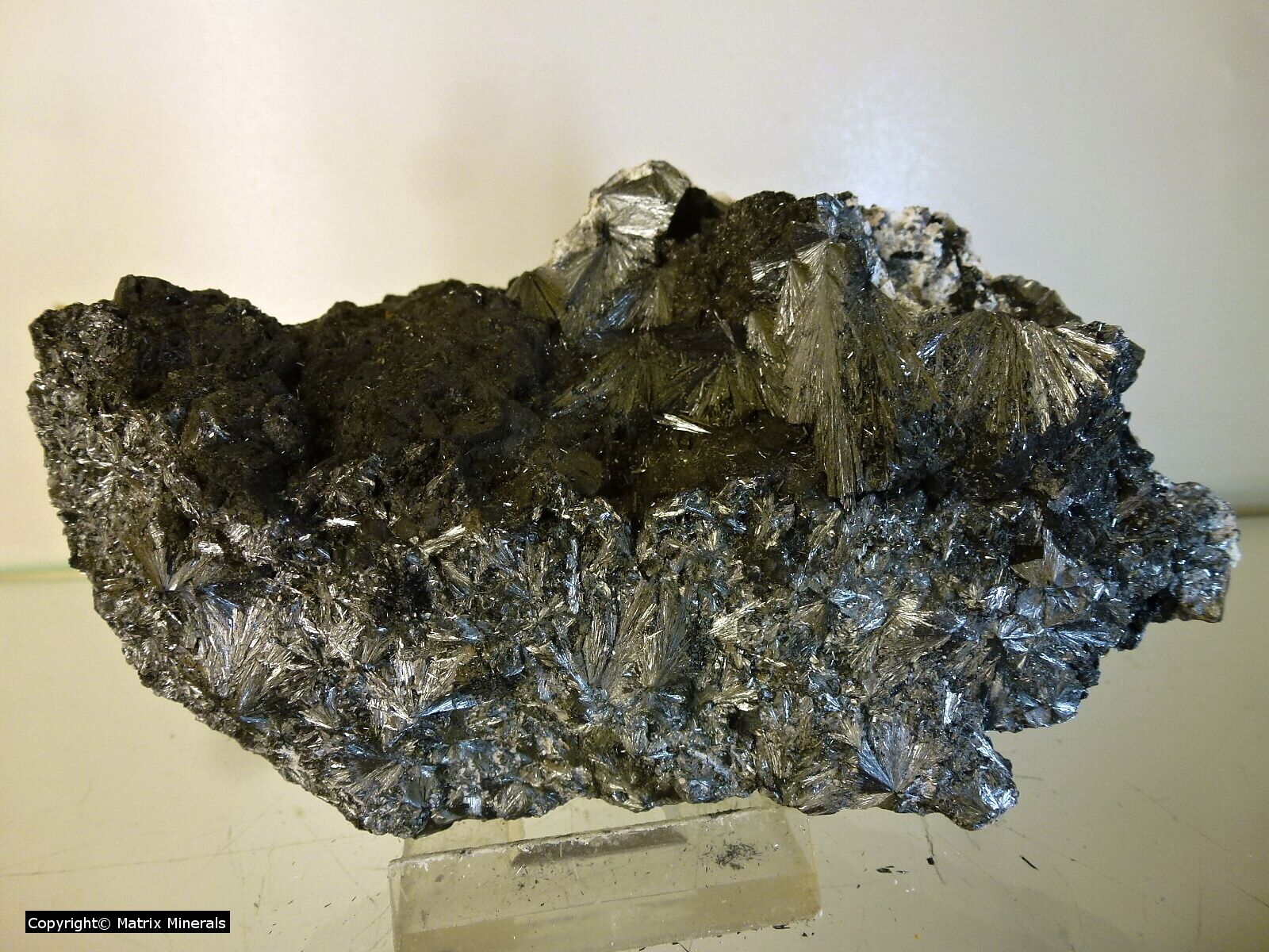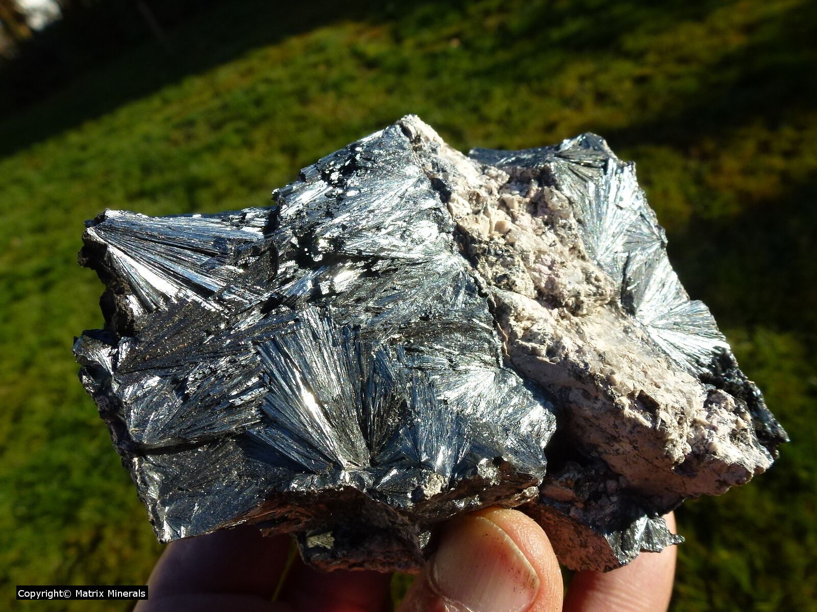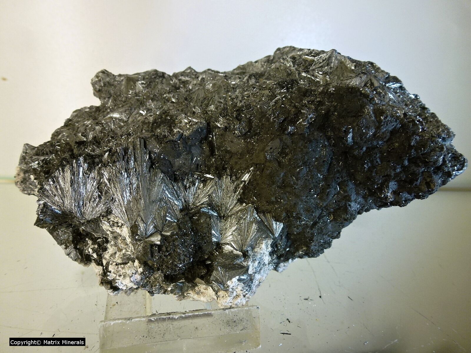 | Fundort:Grube Gremmelsbach Triberg Schwarzwald | Das Mineral Pyrolusit ist ein Manganerz Chem. ( Mno2 ) welches sich hier als nadelige bis radialstrahlige langprismatische Kristalle gebildet haben. Teilweise eingewachsen oder auch freistehende Kristalle je nach Stufe. Sehr intensiver silbriger Glanz. Tolle Sammlerstufen ! In diesem Fall mit eher seltenen freistehenden Kristallen ! |