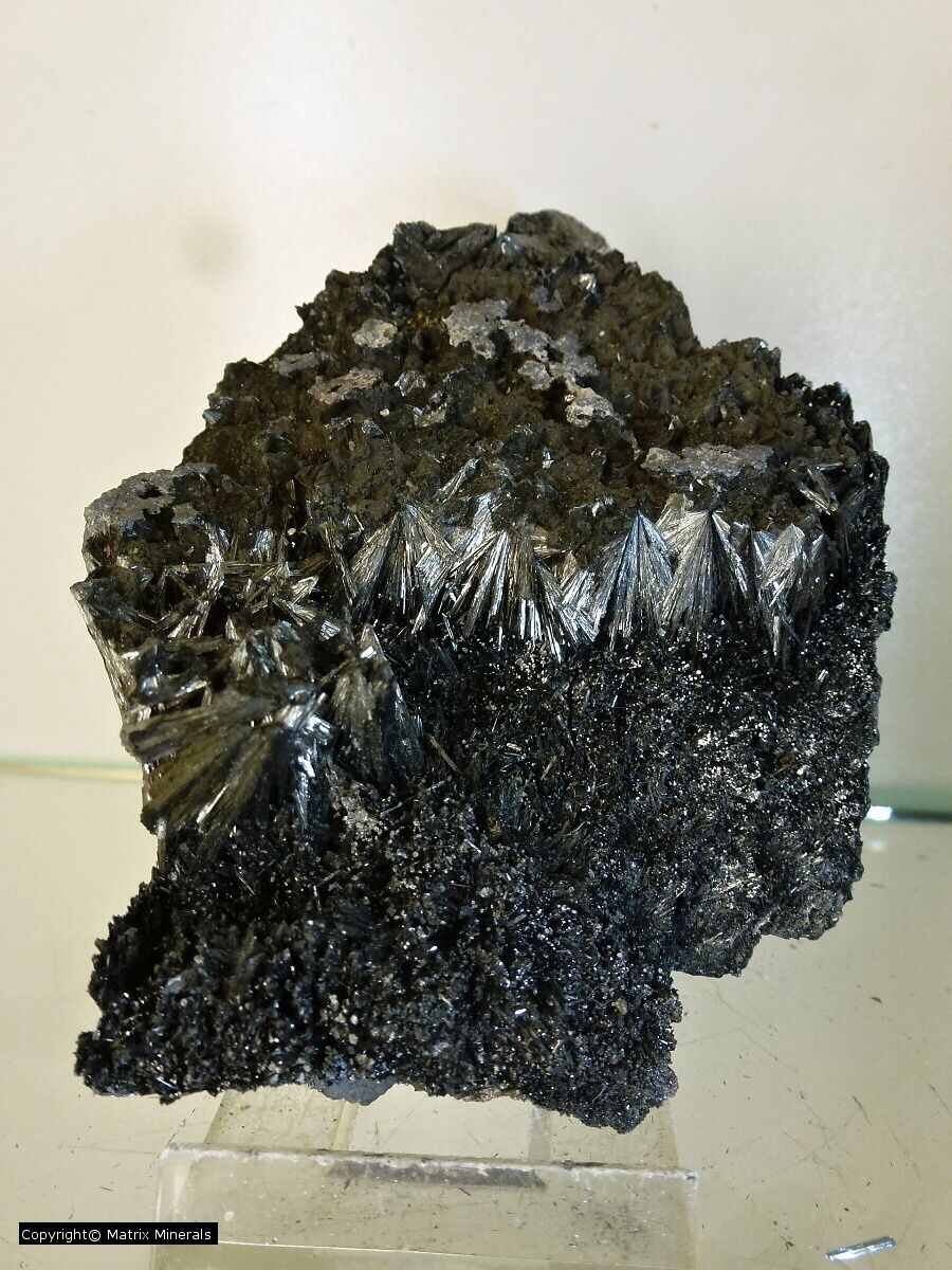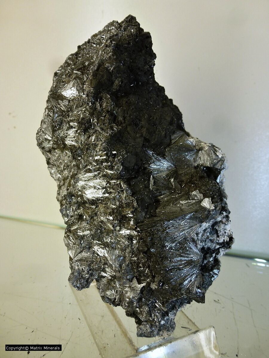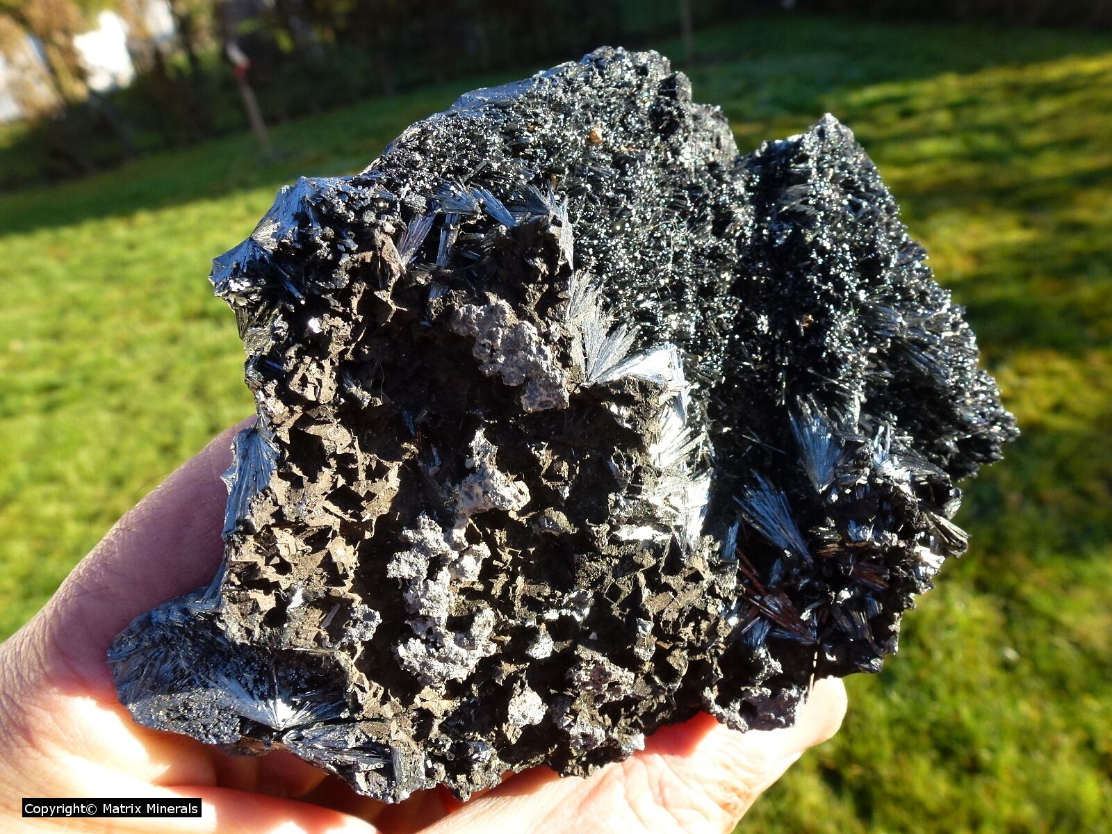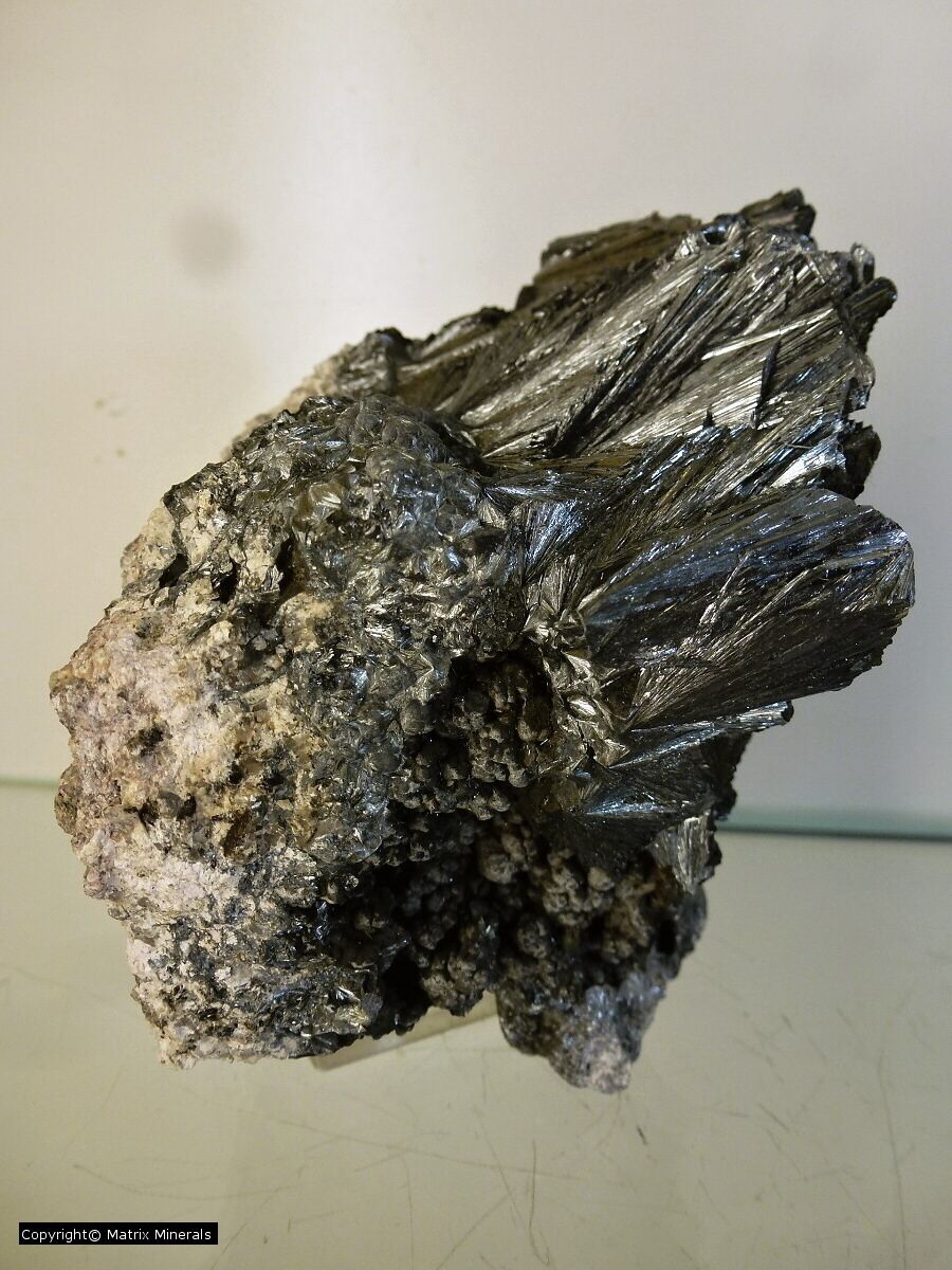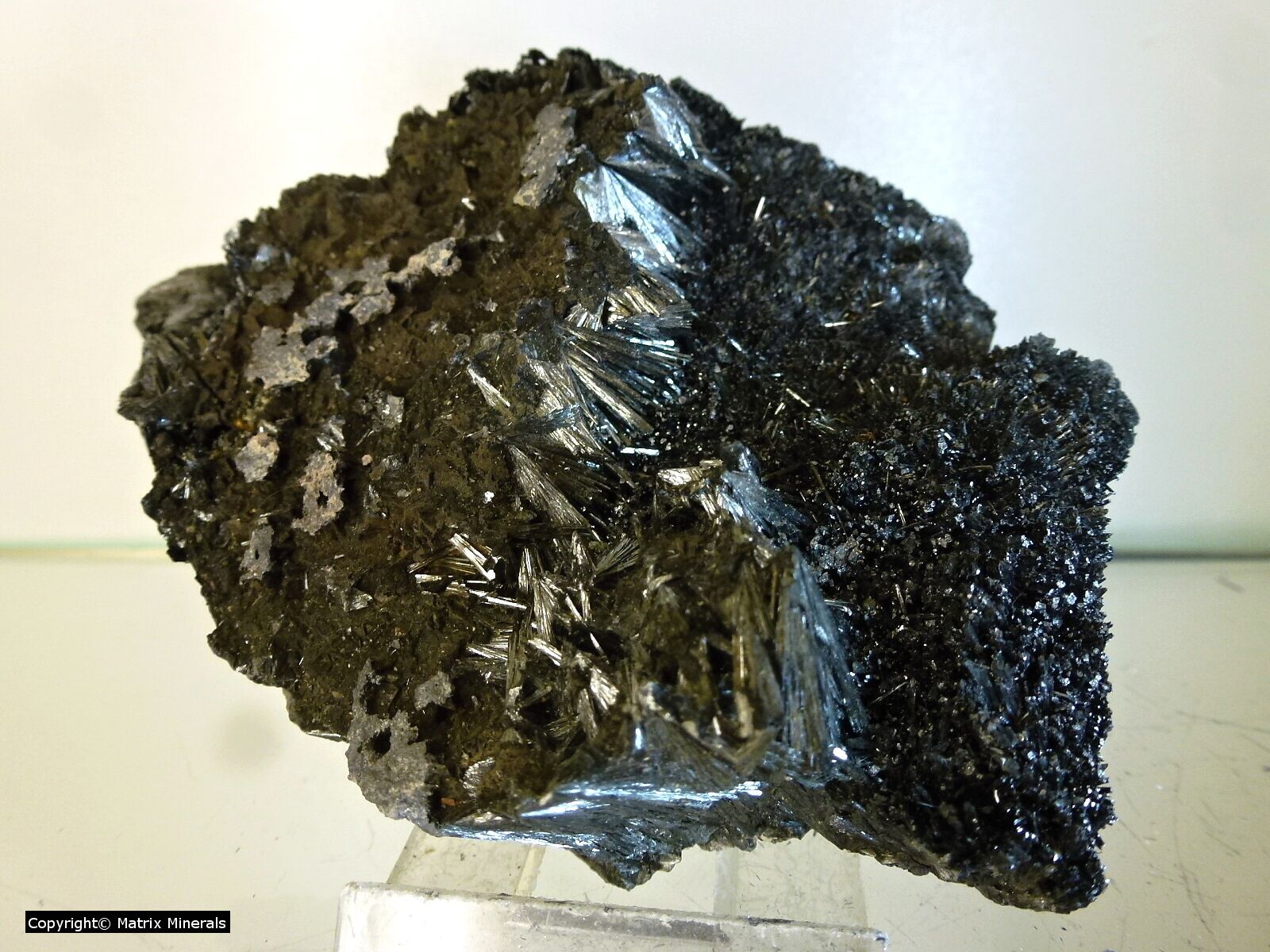 | Fundort:Grube Gremmelsbach Triberg Schwarzwald | Das Mineral Pyrolusit ist ein Manganerz Chem. ( Mno2 ) welches sich hier als nadelige bis radialstrahlige langprismatische Kristalle gebildet haben. Teilweise eingewachsen oder auch freistehende Kristalle je nach Stufe. Sehr intensiver silbriger Glanz. Tolle Sammlerstufen ! In diesem Fall mit eher seltenen freistehenden Kristallen ! |