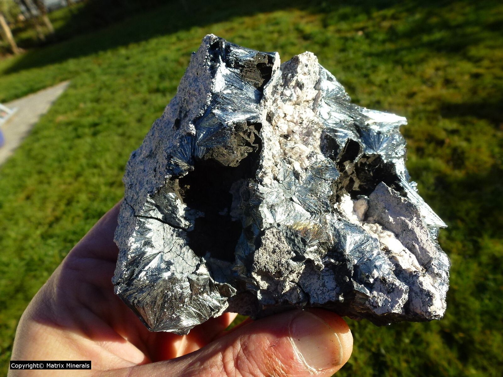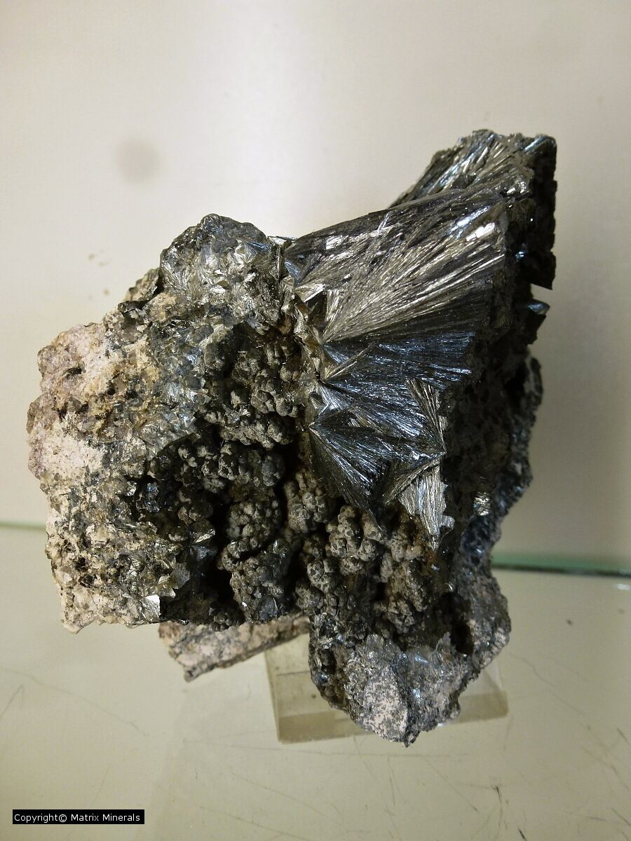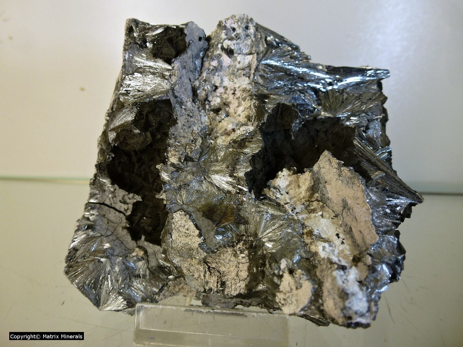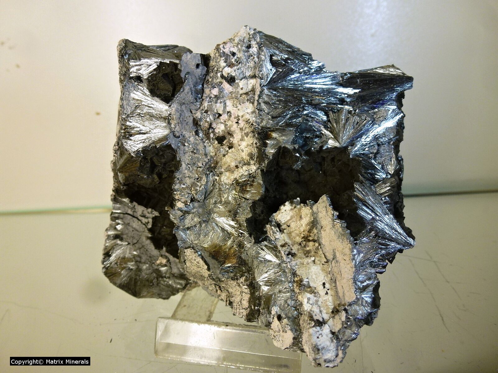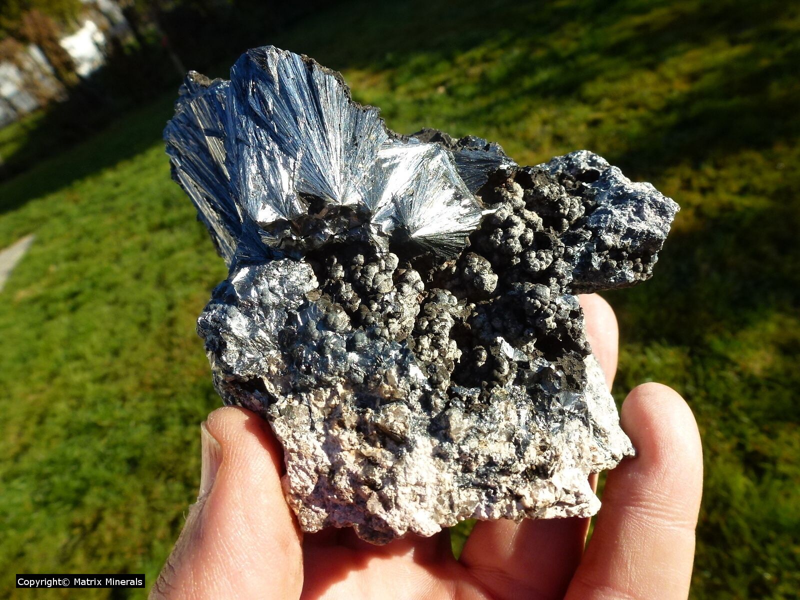 | Fundort:Grube Gremmelsbach Triberg Schwarzwald | Das Mineral Pyrolusit ist ein Manganerz Chem. ( Mno2 ) welches sich hier als nadelige bis radialstrahlige langprismatische Kristalle gebildet haben. Teilweise eingewachsen oder auch freistehende Kristalle je nach Stufe. Sehr intensiver silbriger Glanz. Tolle Sammlerstufen ! In diesem Fall mit eher seltenen freistehenden Kristallen ! |