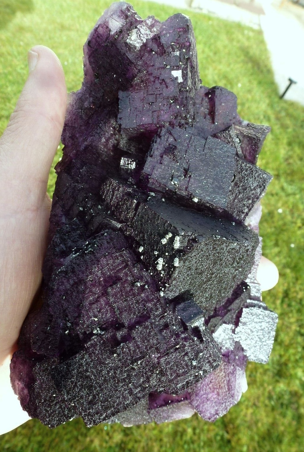 | Fundort: Cave in Rock, Hardin Co. Ill USA | Hier zu sehen eine ältere Stufe aus den 70 iger Jahren von Hardin County Illinois. Wie zu sehen ist handelt es sich um eine große Stufe welche noch leicht mit Calcit xx teilweise überwachsen ist. Auffällig bei dieser Stufe sind die glatten und scharfkanntigen Fluorit Würfel. Die Kristalle sind dunkel Violett leicht durchscheinend. Museumsstück ! |
