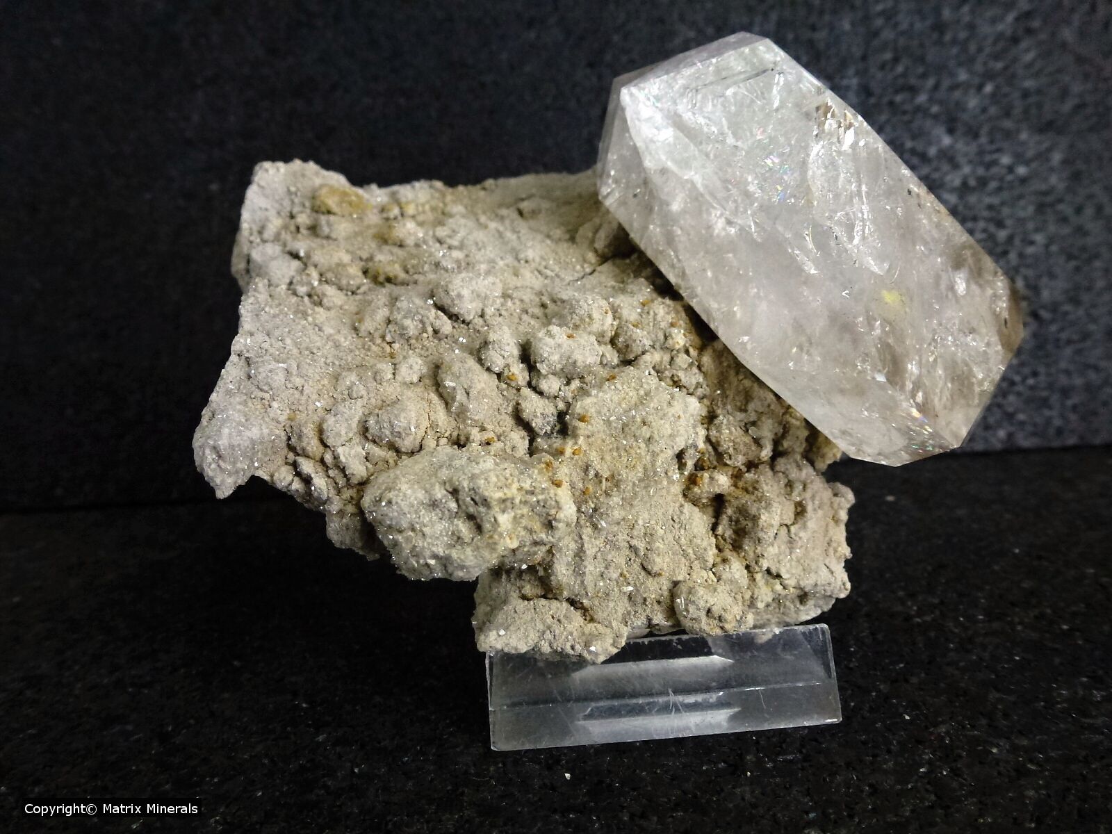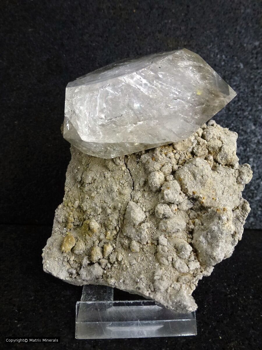 | Fundort: Diamond Mine, Middleville Area, Herkimer Co., State NJ USA | Diese sogenannten Herkimer Quartze sind bekannt auch als Herkimer Diamanten welche nur an einer Fundstelle im NJ Gebiet Middleville gefunden werden. Es sind wasserklare teils als Ketten verwachsene Kristallaggregate die in kleinen Spalten und Klüften vorkommen. Selten auch als größere Einzelkristalle. In diesem Fall eine Stufe mit einem einzelnen makellosen Kristall auf Matrix aufgewachsen.. Makelloses Schaustück ! |