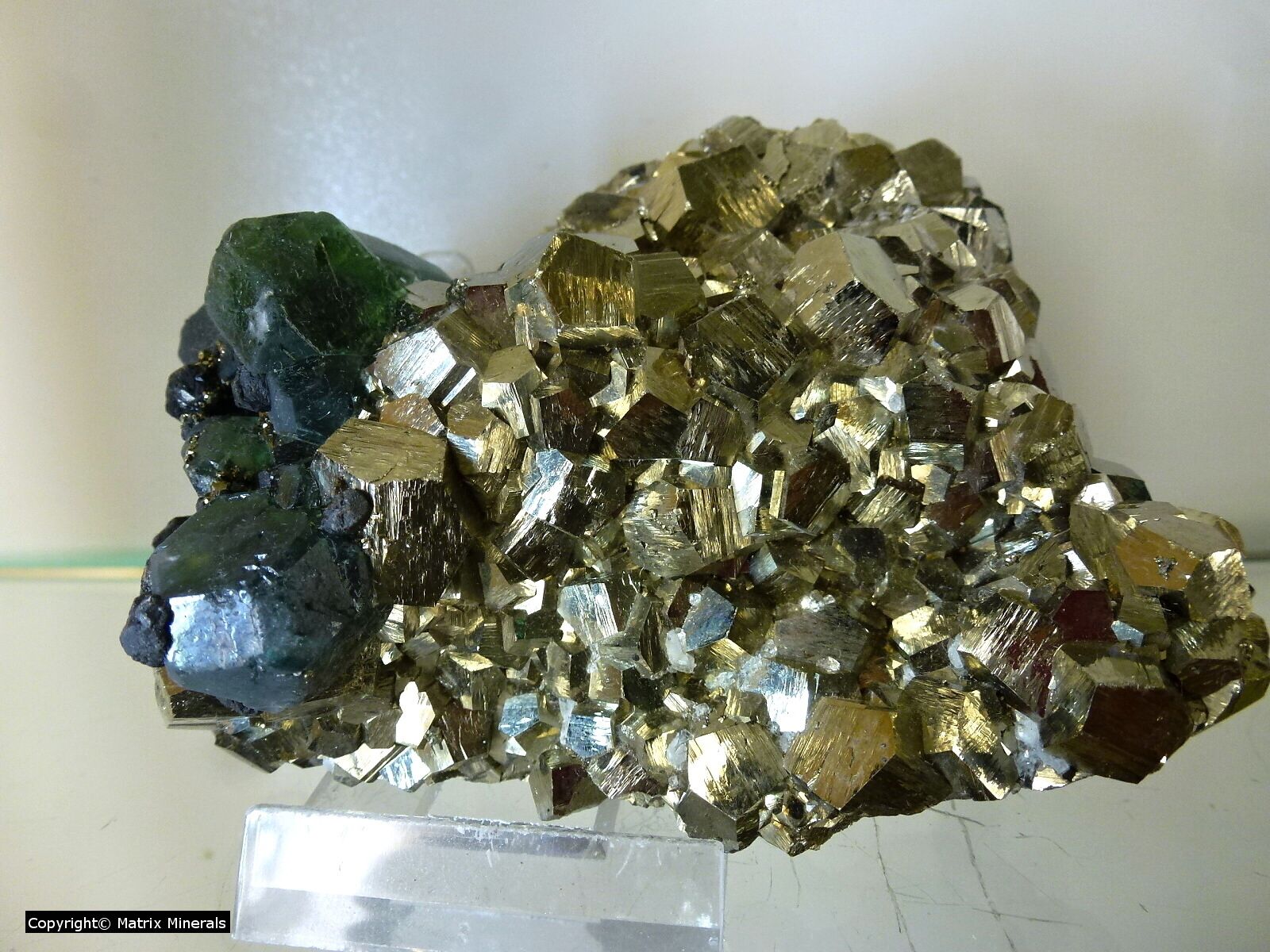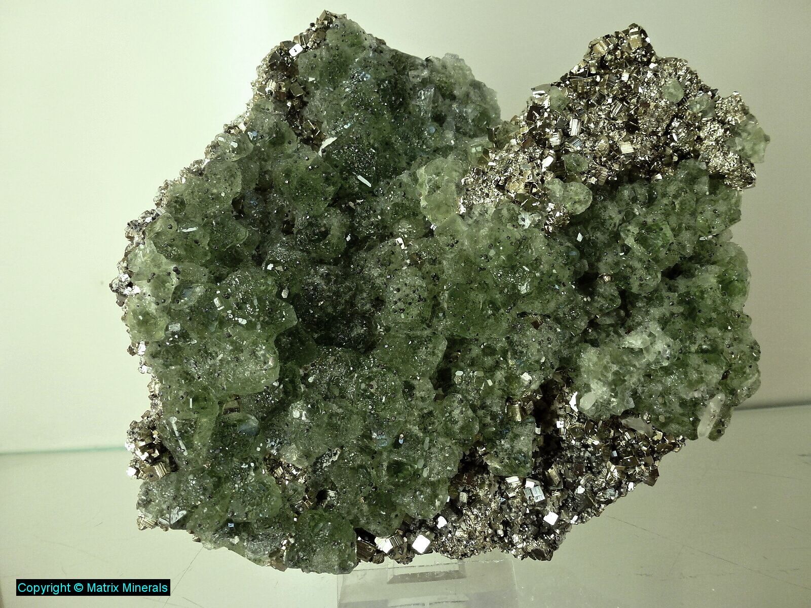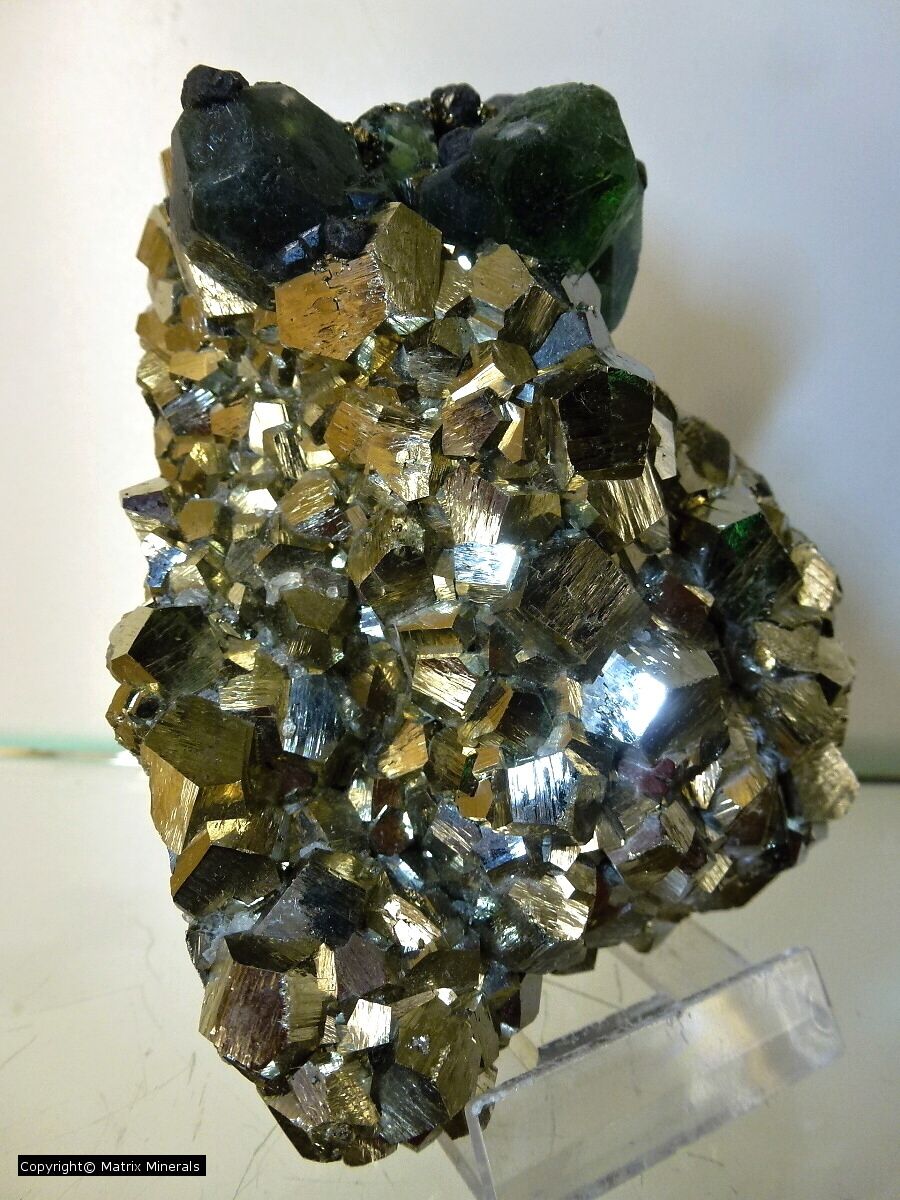 | Fundort: Milpo Mine, Hualanca, Cerro de Pasco, Peru | Es gibt im Bereich Hualanca Cerro de Pasco verschiedene Minen. Eine davon die Milpo Mine. Es wurden im letzten Jahr erstmalig diese grünen Kubooktaeder Fluorite mit Pyrit sowie dem seltenen Geokronit welcher zu den Blei Sulfosalzen mit Antimon zählt gefunden. Grössere Platte bestehend aus einer Pyrit Matrix welche besetzt ist Pyrit xx und mit grünen Fluorit Oktaeder xx. Sehr hochwertig und makellos ! |