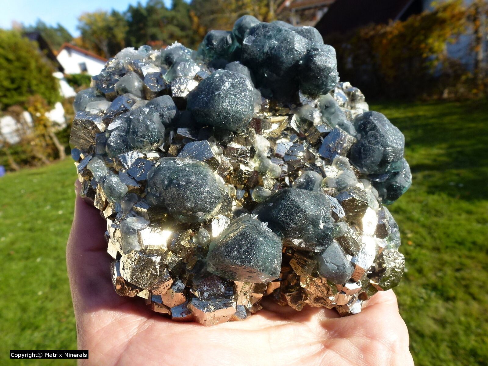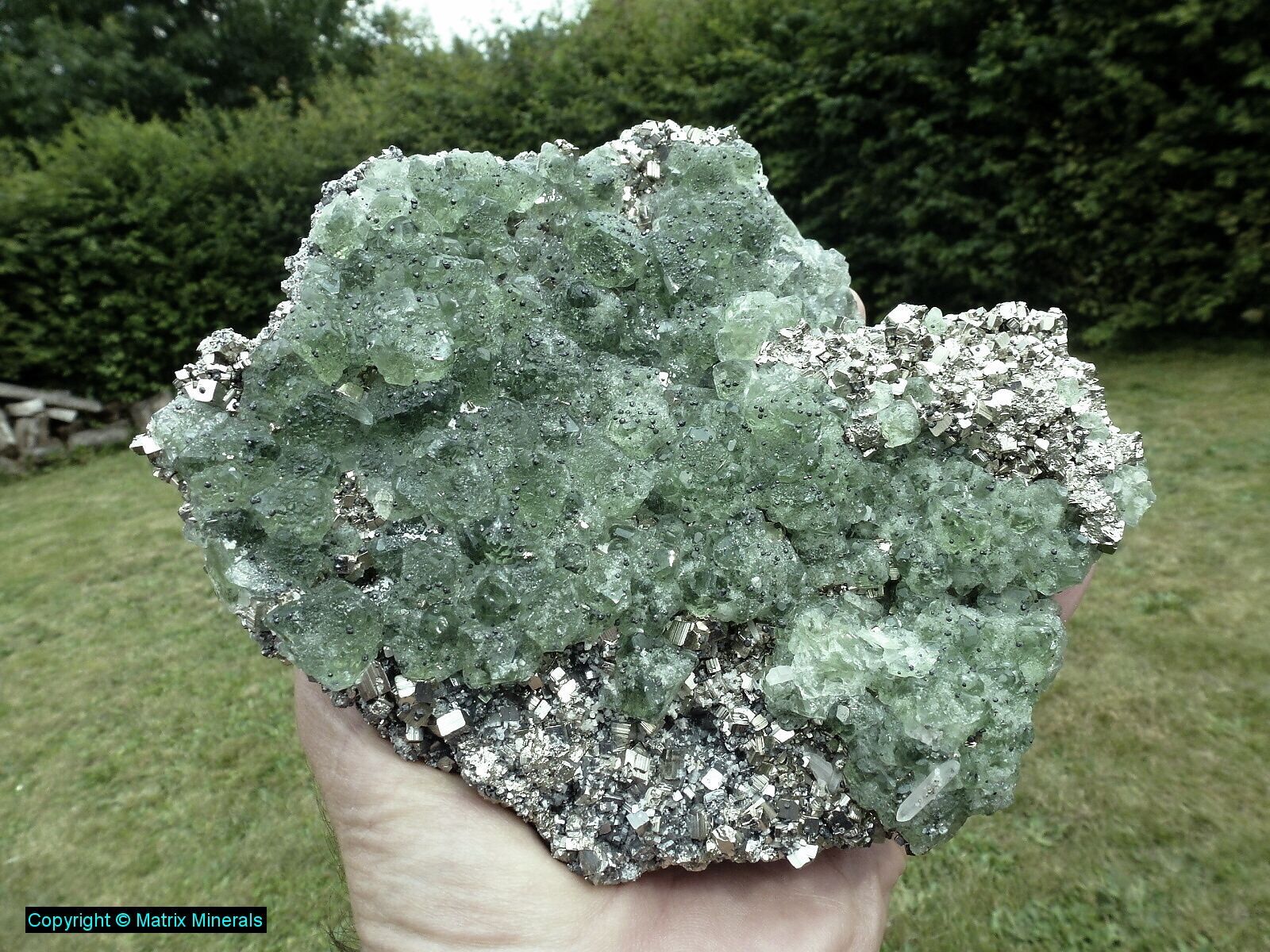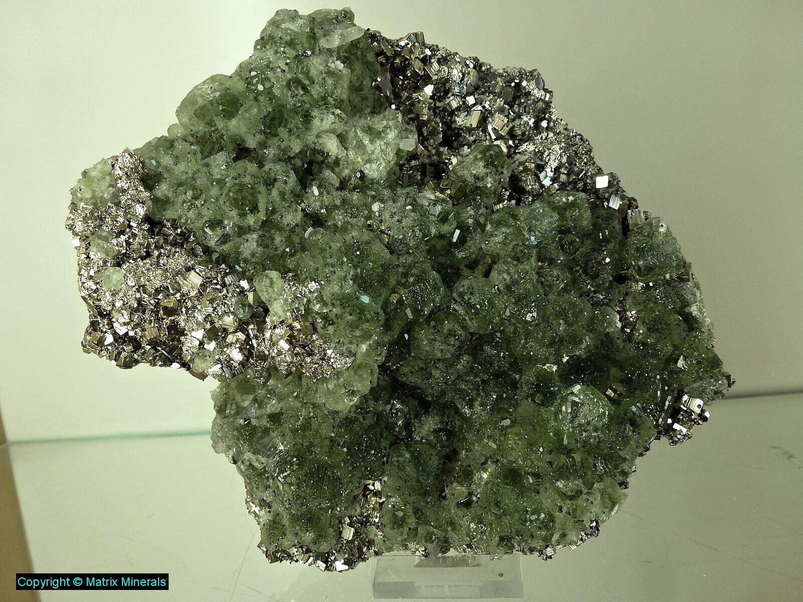 | Fundort: Milpo Mine, Hualanca, Cerro de Pasco, Peru | Es gibt im Bereich Hualanca Cerro de Pasco verschiedene Minen. Eine davon die Milpo Mine. Es wurden im letzten Jahr erstmalig diese grünen Kubooktaeder Fluorite mit Pyrit sowie dem seltenen Geokronit welcher zu den Blei Sulfosalzen mit Antimon zählt gefunden. Grössere Platte bestehend aus einer Pyrit Matrix welche besetzt ist Pyrit xx und mit grünen Fluorit Oktaeder xx. Sehr hochwertig und makellos ! |