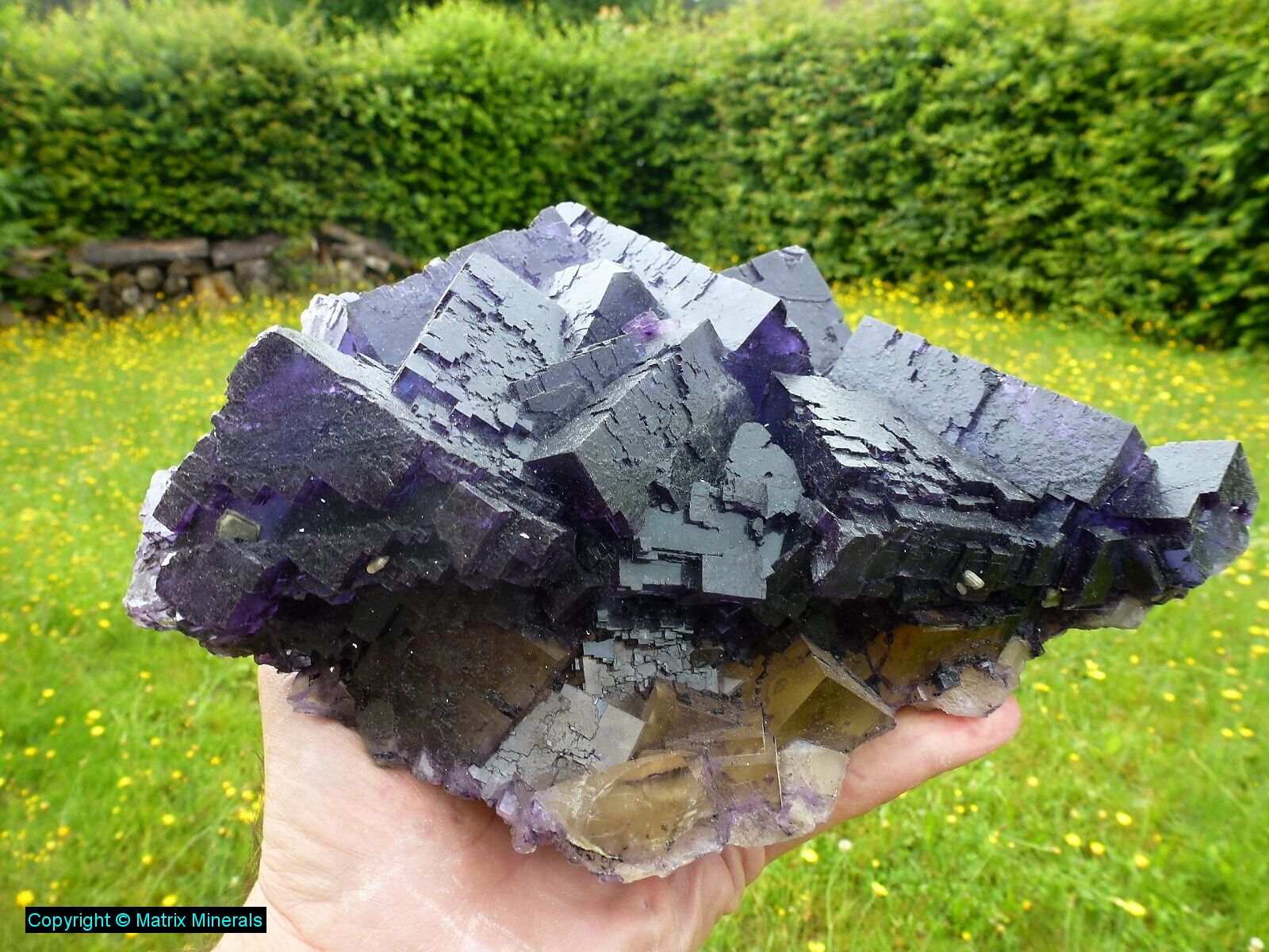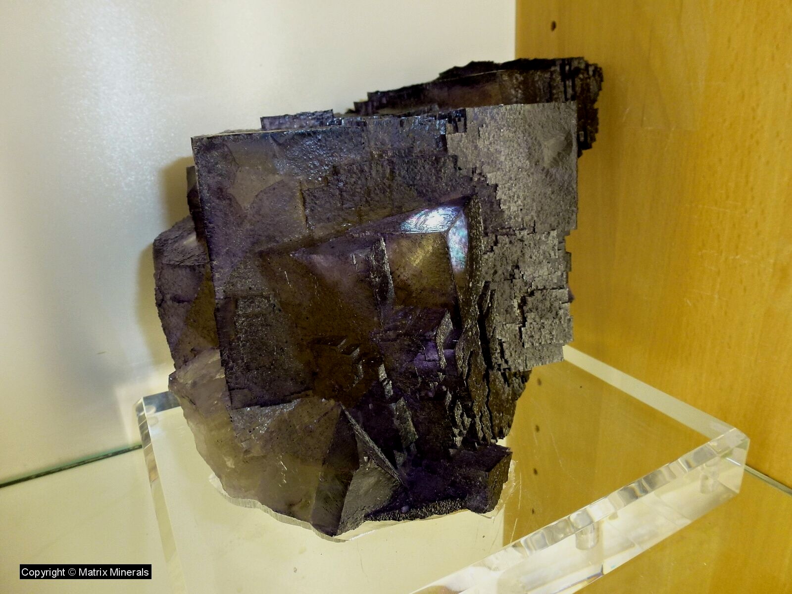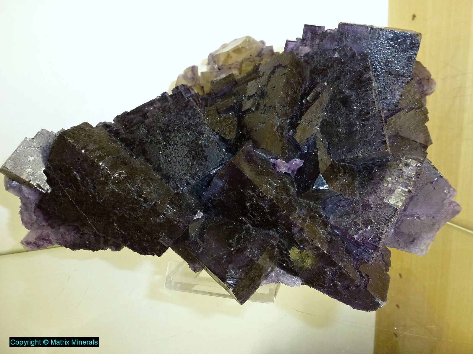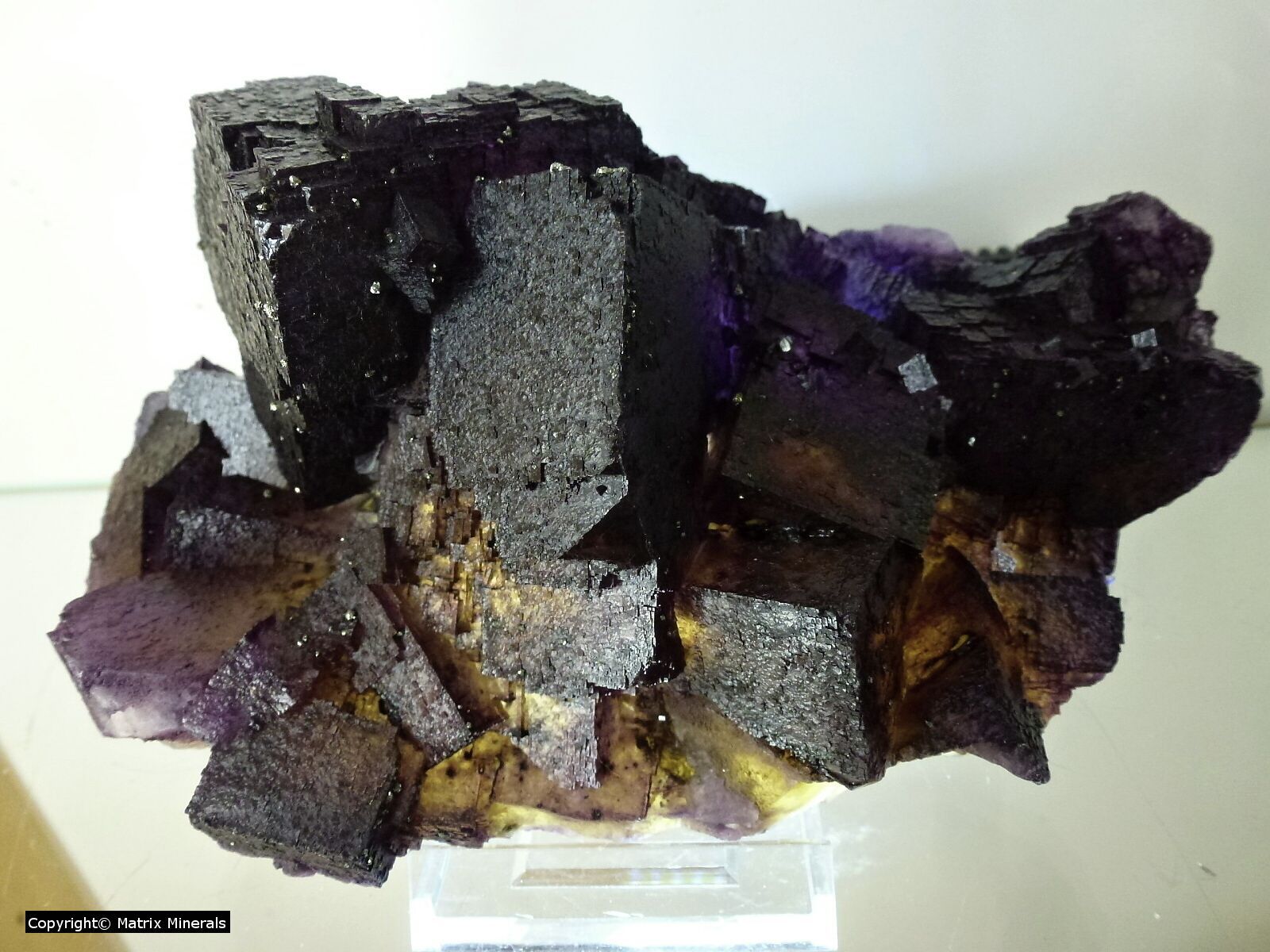 | Fundort: Elmwood Mine, Smith Co. Tennessee USA | Eine weitere recht imposante Museumsstufe mit mehreren verwachsenen großen Fluorit Kristallen welche auf einer Sphalerit Matrix kristallisiert sind. Auch diese Würfel haben an den Kannten zonar verfärbte vielette Zonen. Auch die Parkettierung des Kristalls ist ausgeprägt und makellos kristallisiert. Als Fluorit Freund habe ich natürlich sofort zugeschlagen, und mir das Teil gegönnt. Das Stück wurde auch 2003 gefunden, und stammt aus alter Sammlung. Es steht jetzt vorerst in meiner Sammlung und ist auf Anfrage auch zu Verkaufen. Das Kristalaggregat sitzt auf einen maßgeschneiderten custom made Acrylglassockel. Extrem Hochwertig und ästhetisch ! Mega ! Museumsqualität ! |