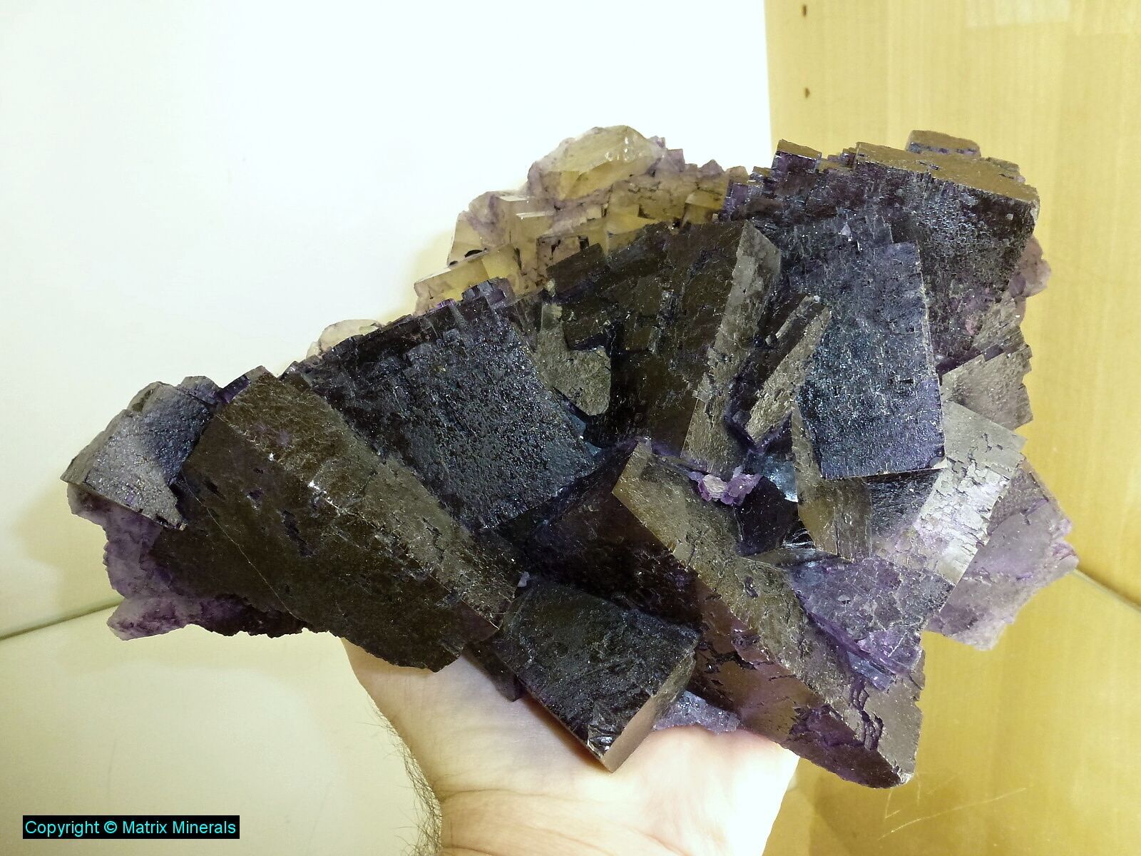 | Fundort: Denton Mine, Hardin Co. Illinois USA | Hier zu sehen eine sagenhafte Stufe mit mehrfarbigen Fluorit xx von violett bis rot und gelblich. Die Kristallwürfel bestehen aus 2 Generationen Fluorit, unten darunter die gelben dann die violetten darüber gewachsen. Schöne scharfkanntige Würfel bis 9 cm mit ausgeprägter Parkettierung. Tolles Schaustück aus alten Tagen von ca. 1980 von der Denton Mine. Diese Stufe stammt aus älterer Sammlung. Mega !Info zu Denton Mine |