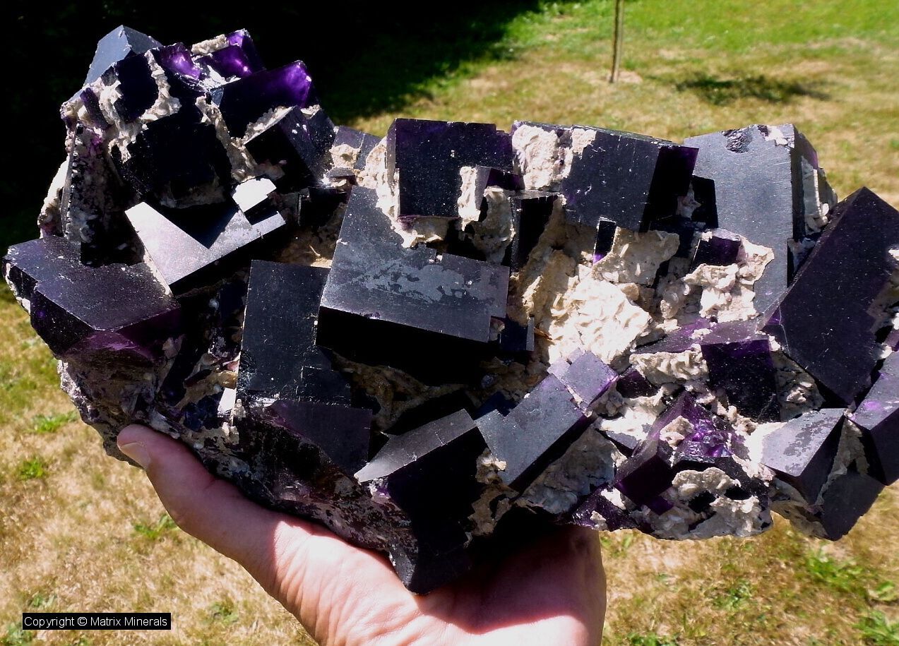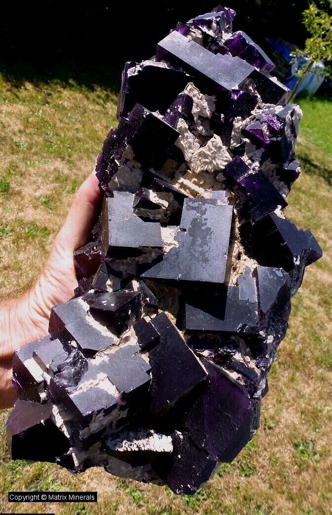 | Fundort: Cave in Rock, Hardin Co. Ill USA | Hier zu sehen eine ältere Stufe aus den 70 iger Jahren von Hardin County Illinois. Wie zu sehen ist handelt es sich um eine große Stufe welche noch leicht mit Calcit xx teilweise überwachsen ist. Auffällig bei dieser Stufe sind die glatten und scharfkanntigen Fluorit Würfel. Die Kristalle sind dunkel Violett leicht durchscheinend. Museumsstück ! |