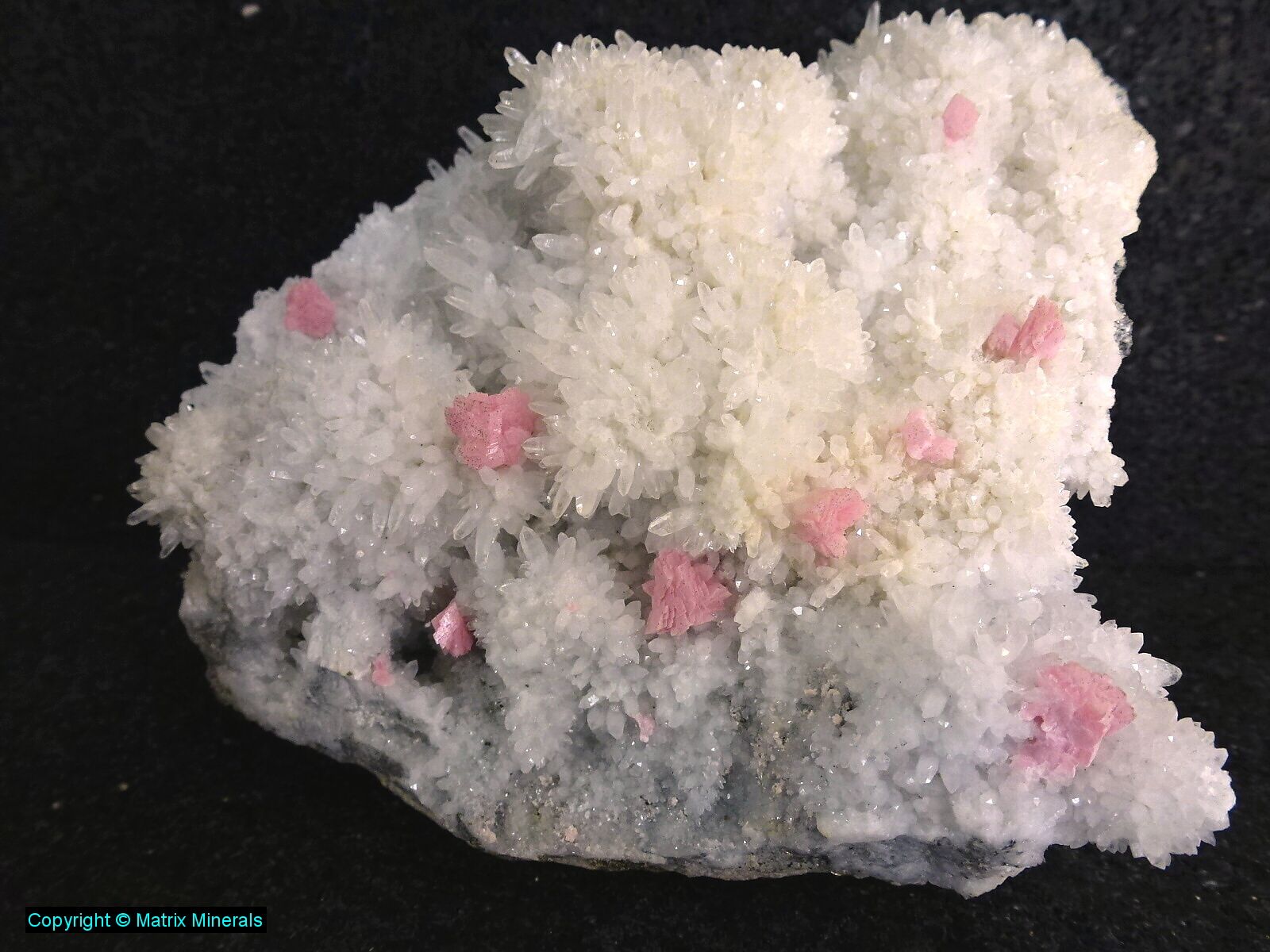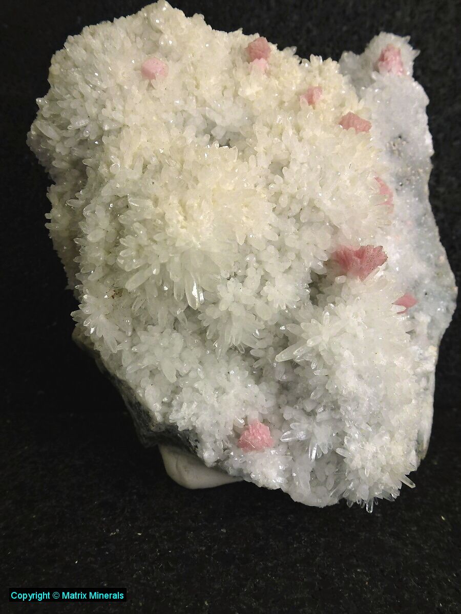 | Fundort: Silverton Tunnel Mine, Colorado USA | Schönes großes Schaustück mit Quartz Kristallen welche besetzt sind mit winzigen Pyrit xx sowie einigen recht hübschen Rhodochrosit xx. Schöner Kontrasst pink auf schneeweissen Untergrund. Unbeschädigtes Schaustück. Selten im Angebot ! |