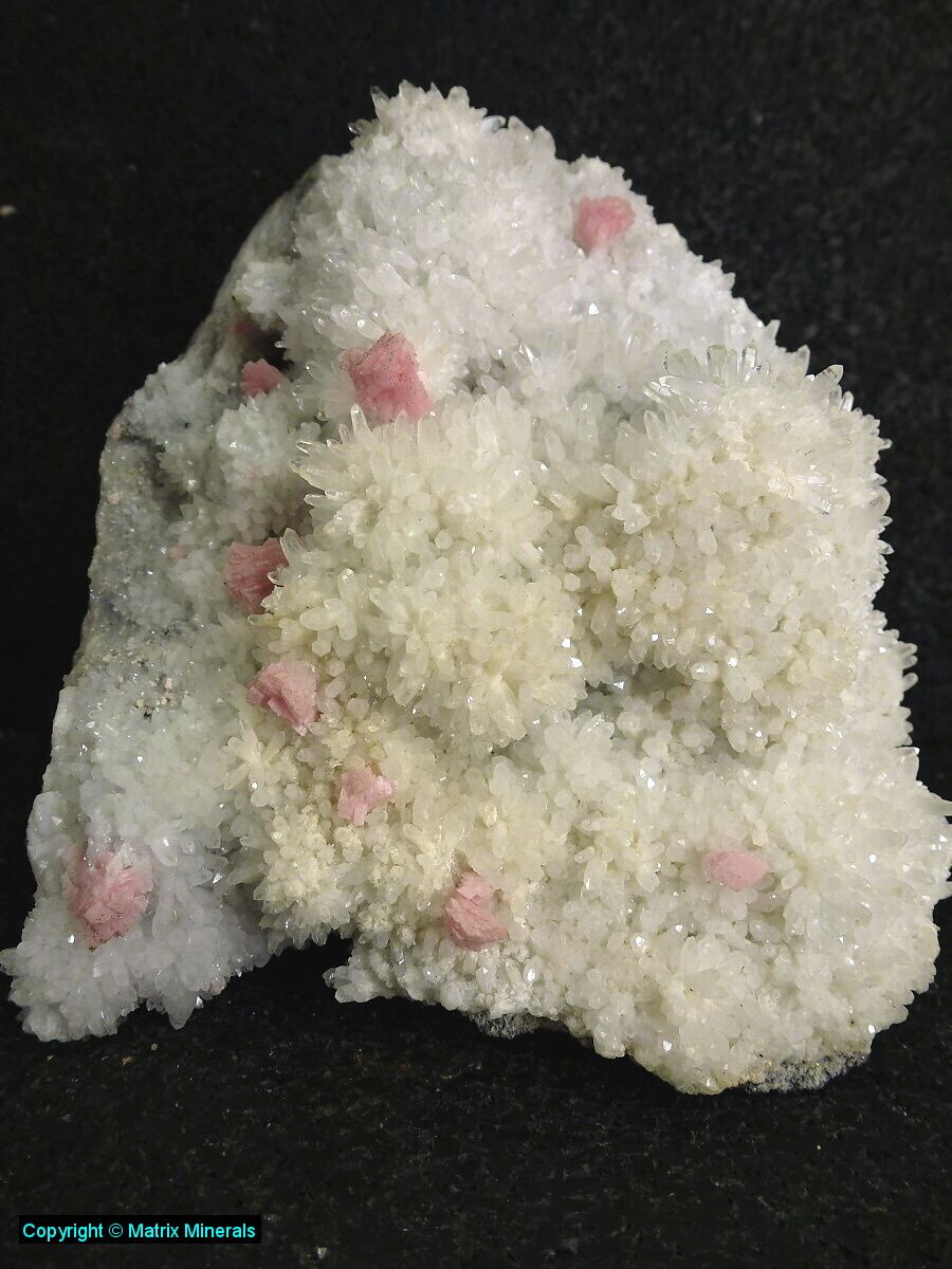 | Fundort: Sweethome Mine, Mt.Bross, Colorado USA | Hier eine der wenigen Stufen von Sweethome Mine. Es ist eine Platte besetzt mit kleineren Quartz xx welche von Rhodochrosit Rhomboeder xx begleitet werden. Insgesamt ein sehr ansprechendes Stück mit intensiv fleischrot farbenen Rhodochrosit xx. Solche Stücke sind sehr schwer zu bekommen, ich denke das ist ein ganz passables Sammlerstück in guter Qualität. Selten im Angebot ! |