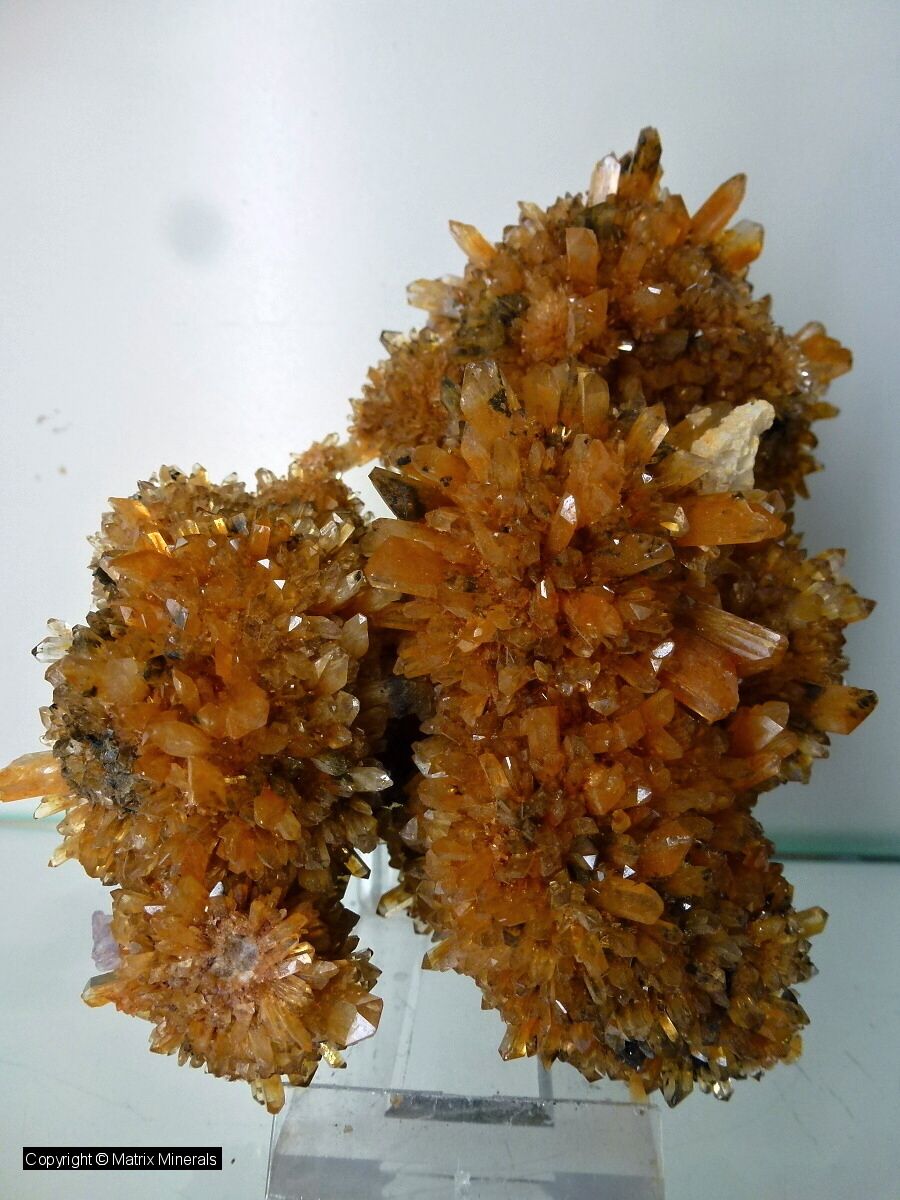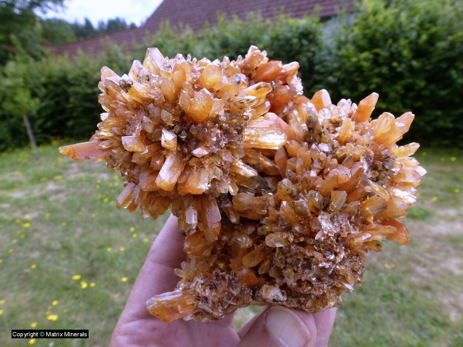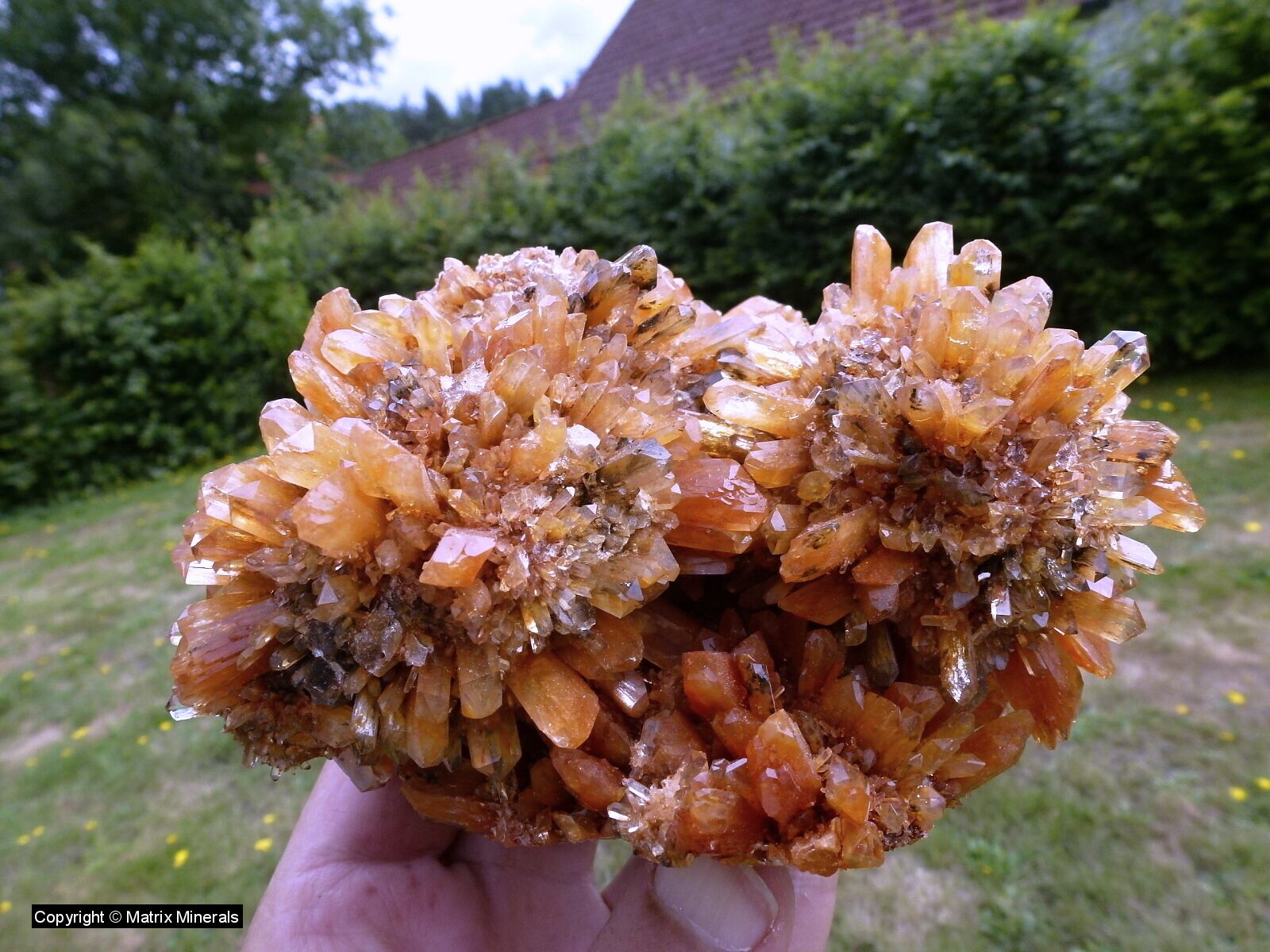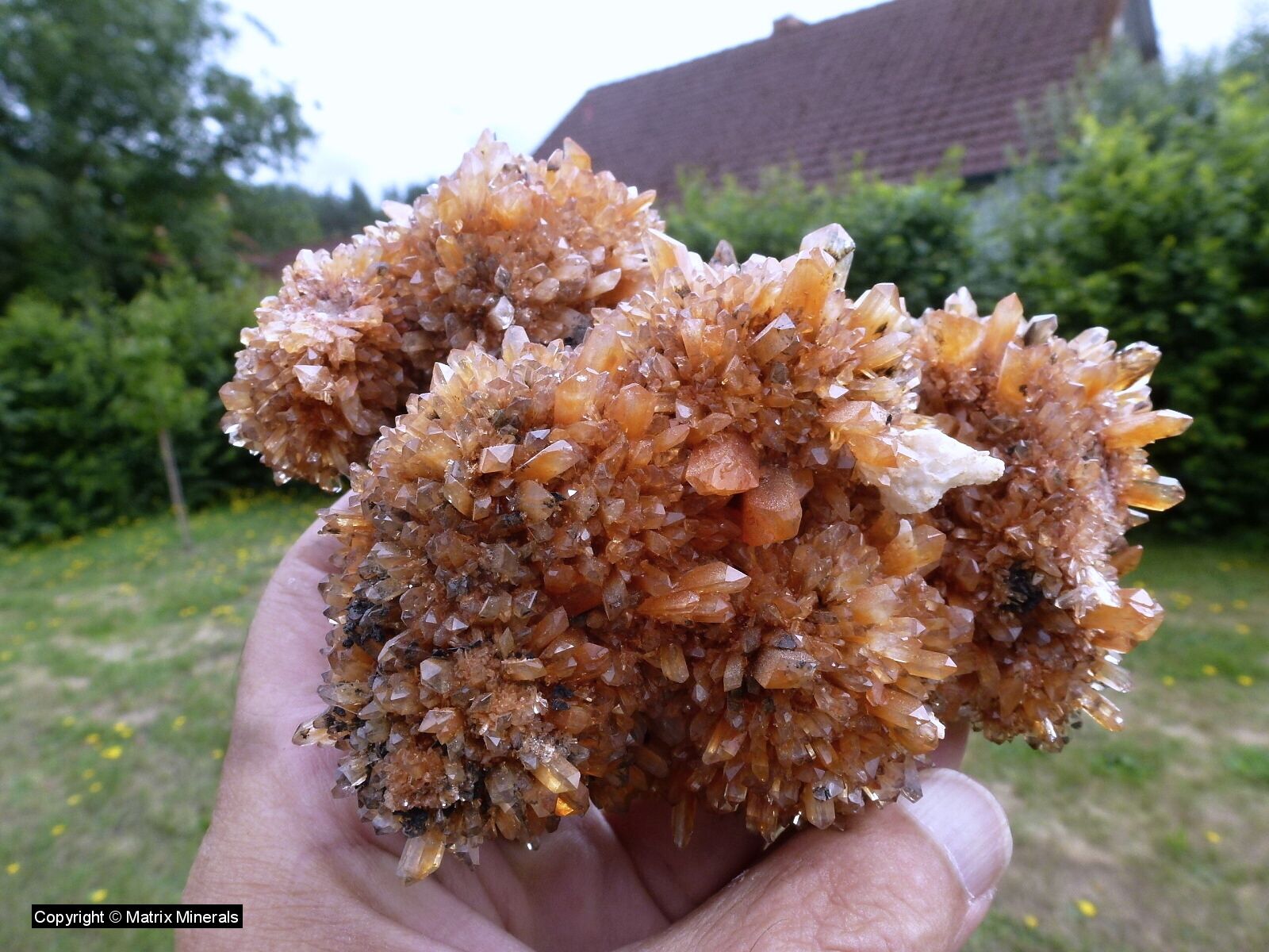 | Fundort: Mina Navidat, Abasolo Durango Mexiko | Vor längerer Zeit gab es mal einen Fund mit den Creedit Stufen in Mexiko. Die Zeiten sind auch schon lange vorbei. Es sind hübsche Handstücke mit goldgelblich rötlichen Kristallen welche radialstrahlige Kugeln bilden. Hier zu sehen noch einige Altbestände von 2010 mit recht ordentlichen Stücken von Creedit xx teils mit Fluorit vergesellschaftet. |