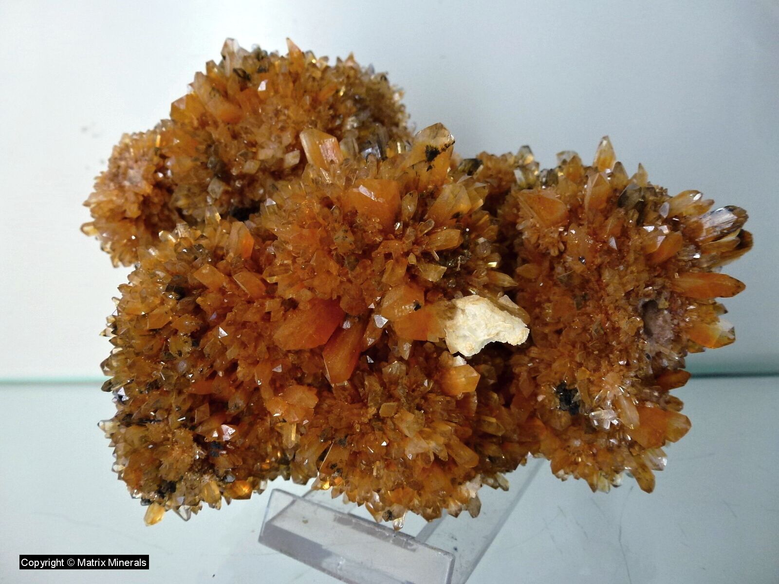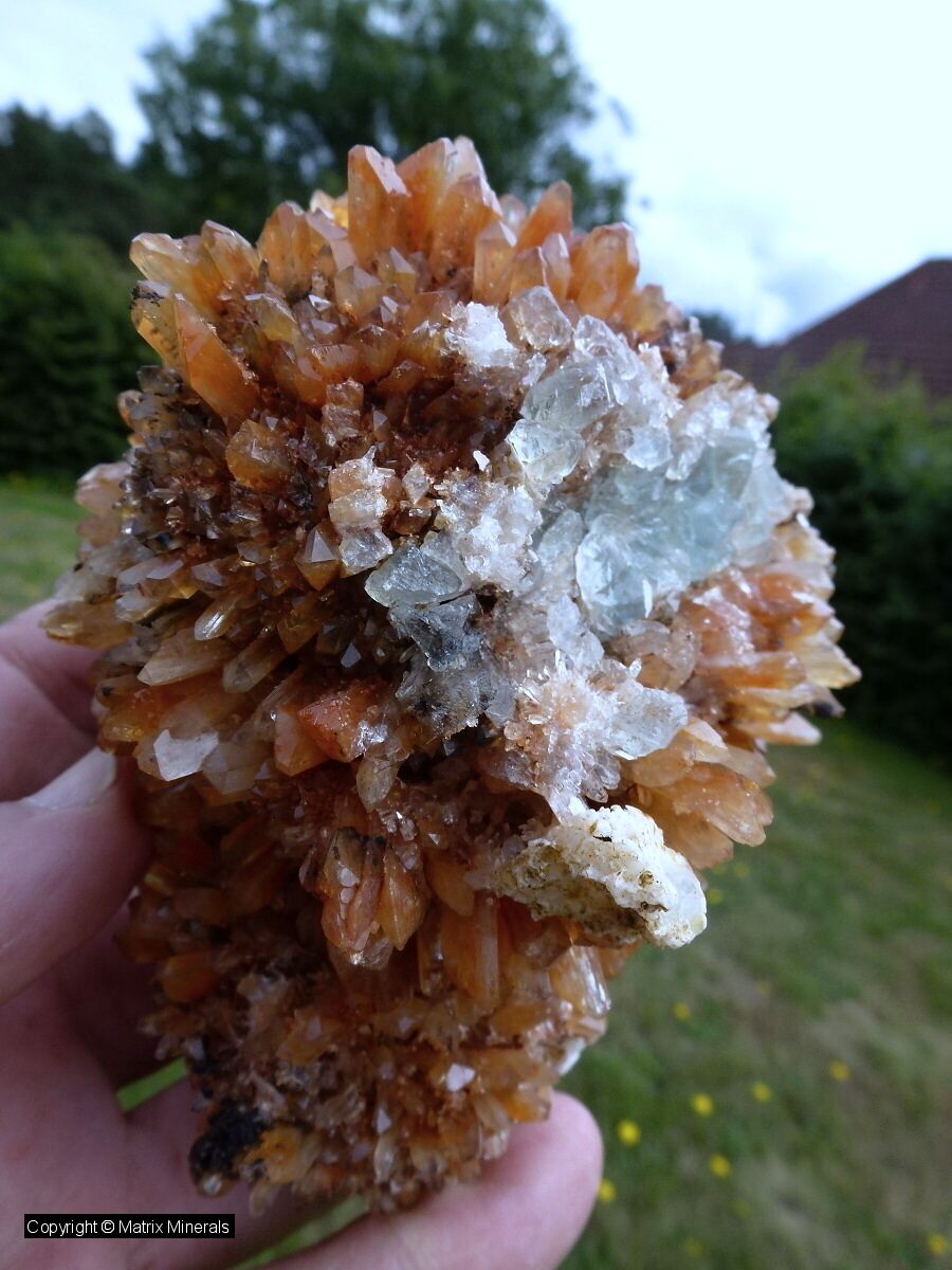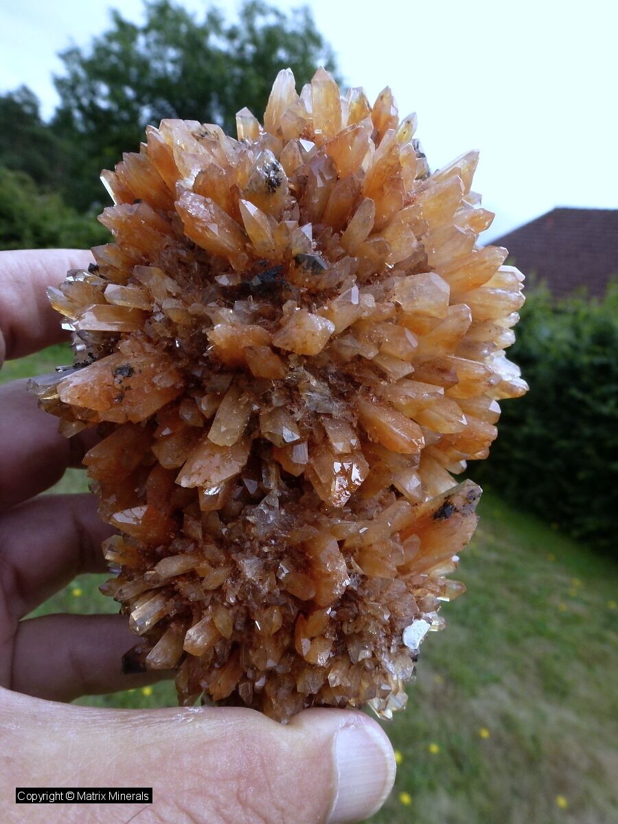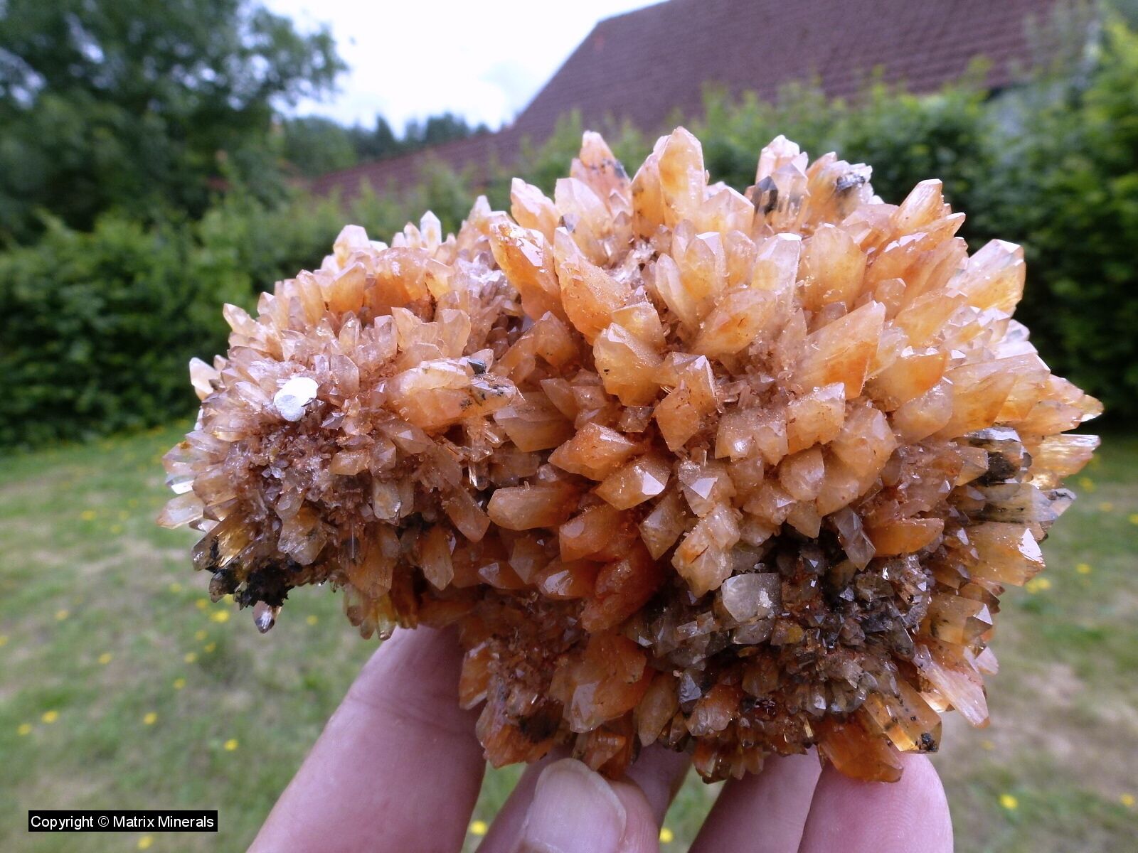 | Fundort: Mina Navidat, Abasolo Durango Mexiko | Vor längerer Zeit gab es mal einen Fund mit den Creedit Stufen in Mexiko. Die Zeiten sind auch schon lange vorbei. Es sind hübsche Handstücke mit goldgelblich rötlichen Kristallen welche radialstrahlige Kugeln bilden. Hier zu sehen noch einige Altbestände von 2010 mit recht ordentlichen Stücken von Creedit xx teils mit Fluorit vergesellschaftet. |