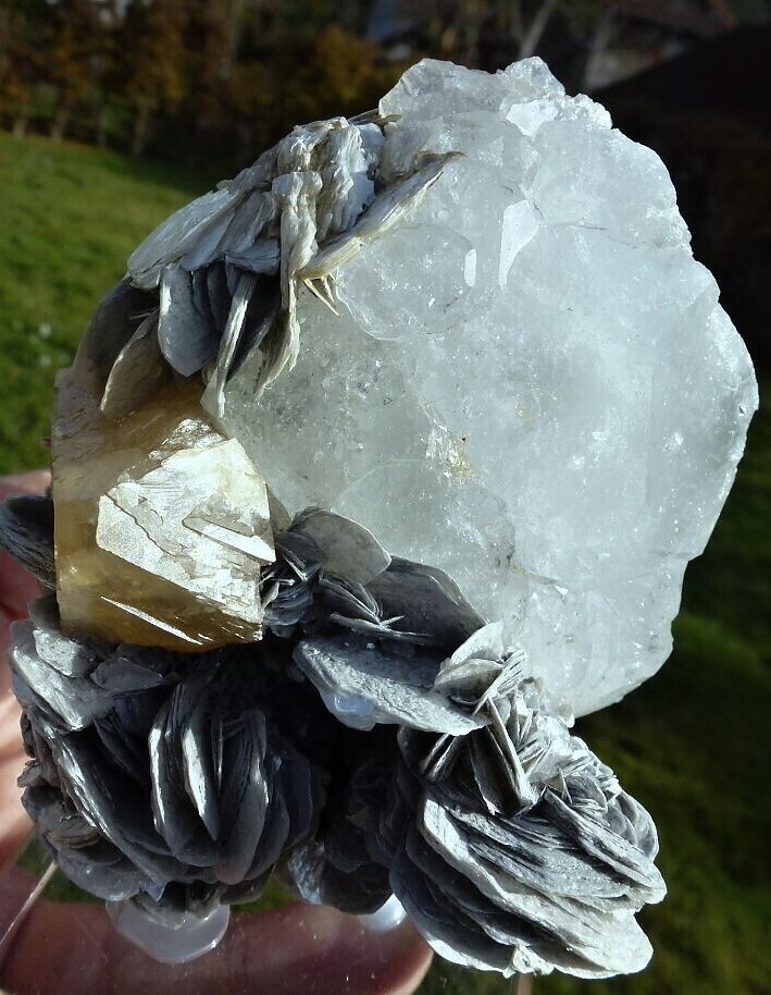 | Fundort: Pingwu Mine, Xueboading Mountains, Sichuan China | Hier eine Stufe mit Muskovit Glimmer xx vergesellschaftet mit Aquamarin xx var. Goshenit in Begleitung von einem Scheelit xx. Seltenes und sehr hochwertiges Stück aus eigener Sammlung. Die Stufe sitzt auf einem Acrylglassockel ! |